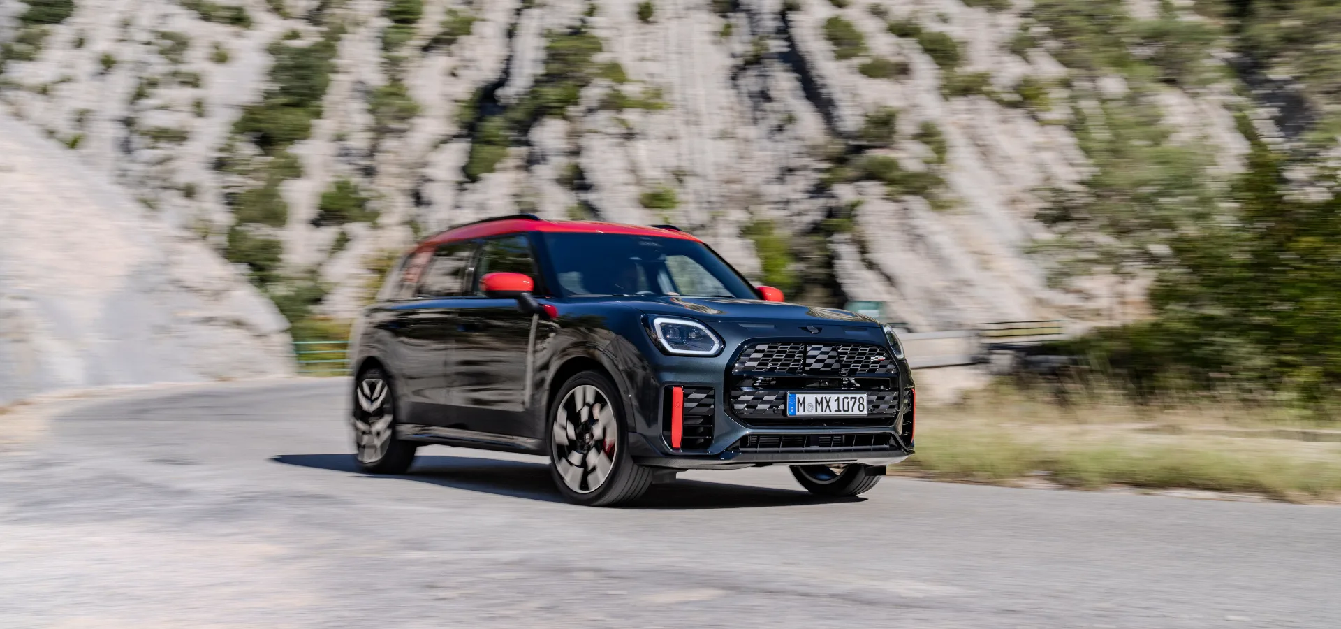 The MINI JCW offers 300 HP power, 400 Nm torque, Steptronic Sport transmission with double clutch, all-wheel drive, and a 0–100 km/h acceleration in 5.4 seconds — built for pure performance.